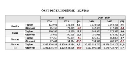2025’in ilk 10 aylık döneminde toplam pazar, bir önceki yılın aynı dönemine göre yüzde 10 artarak 1 milyon 78 bin 527 adet düzeyinde gerçekleşti. Bu dönemde, otomobil pazarı da yüzde 11 oranında artış sağladı ve 833 bin 382 adet oldu. Ticari araç pazarına bakıldığında ise yılın ilk 10 ayında, bir önceki yılın aynı dönemine kıyasla toplam ticari araç pazarı yüzde 5, hafif ticari araç pazarı ise yüzde 7 büyürken ağır ticari araç pazarında yüzde 6 gerileme yaşandı. 2025 yılı ocak-ekim döneminde otomobil satışlarındaki yerli araç payı yüzde 30, hafif ticari araç pazarında yerli araç payı ise yüzde 21 olarak gerçekleşti.