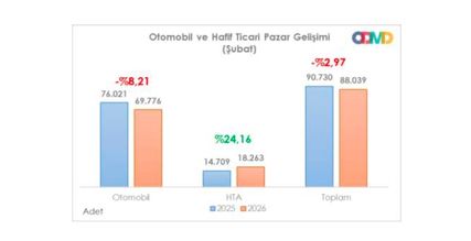 ODMD raporu kapsamın 2026 yılı Şubat ayı otomobil ve hafif ticari araç pazarı 2025 yılı Şubat ayına göre %2,97 daralarak 88.039 adet oldu. 2026 Şubat ayında otomobil satışları bir önceki yılın aynı ayına göre %8,21 daralarak 69.776 adet, hafif ticari araç pazarı %24,16 artarak 18.263 adet oldu. Otomobil ve hafif ticari araç pazarı 10 yıllık Şubat ayı ortalama satışlara göre %45,6 arttı. Otomobil pazarı, 10 yıllık Şubat ayı ortalama satışlara göre %49,2 artış gösterdi. Hafif ticari araç pazarı, 10 yıllık Şubat ayı ortalama satışlara göre %33,2 arttı.